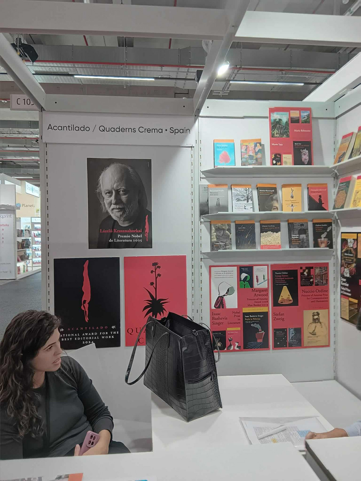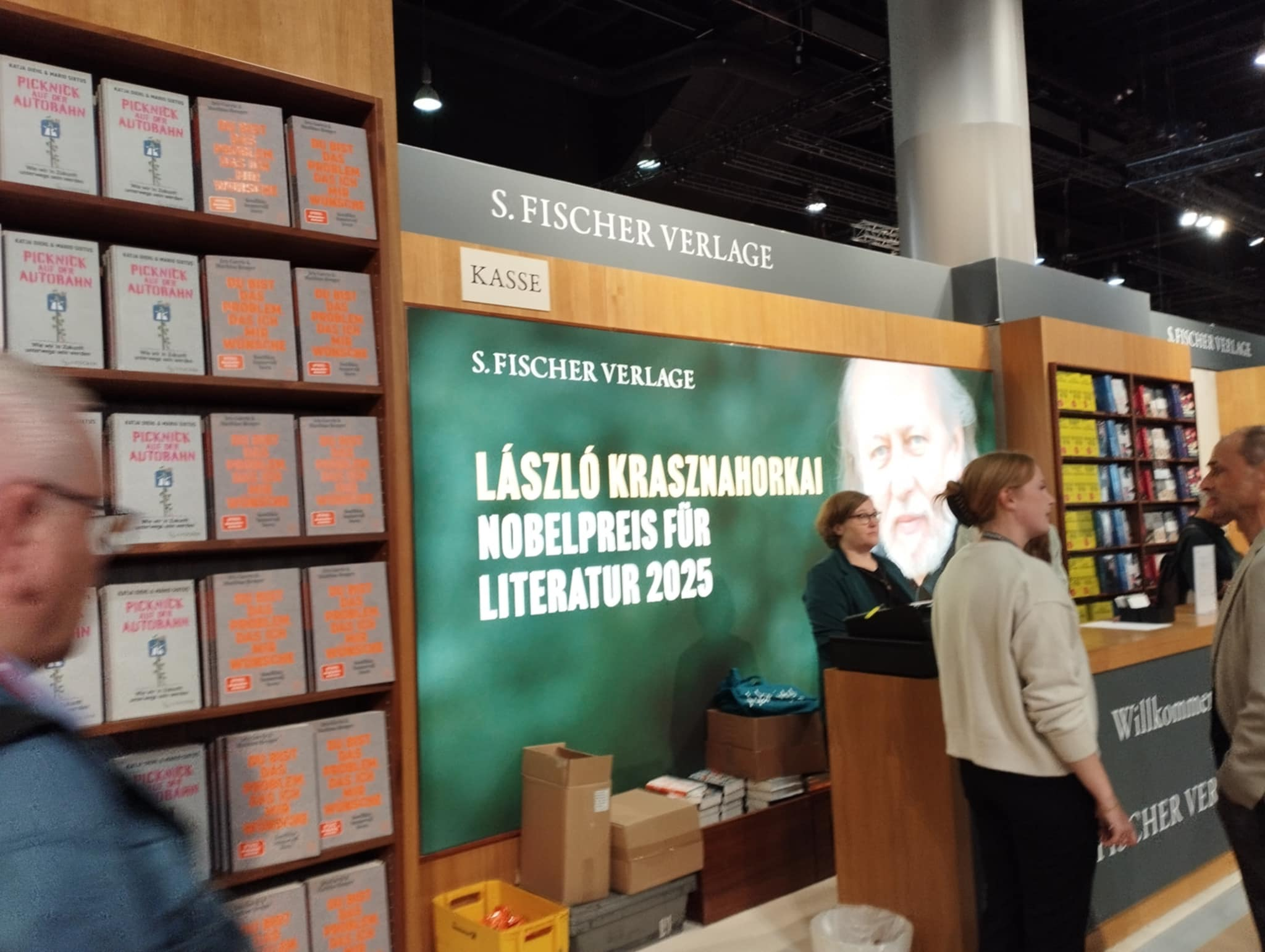 Míg más országok, például a német, spanyol és olasz kiadók ledfallal, kitűzőkkel, szórólapokkal, roll-uppal és sok-sok Krasznahorkai-kötettel ünnepelték a magyar szerző sikerét, addig a hazánk képviselői meglehetősen szerény eszközöket választottak: beszámolók szerint mindössze néhány Krasznahorkai-könyv az egyik polc tetején és egy utólag kihelyezett A4-es papír jelezte, hogy magyar szerző nyerte a Nobel-díjat.