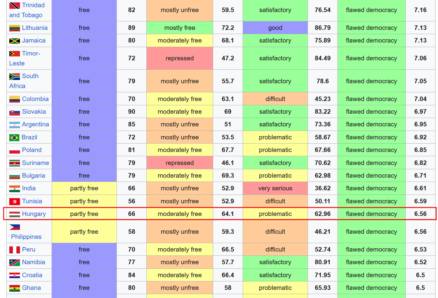 Magyarorszag epp a helye'n van Tunezia, India, vagy Bulgaria utan, de Namibia, vagy Peru elott: